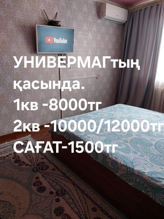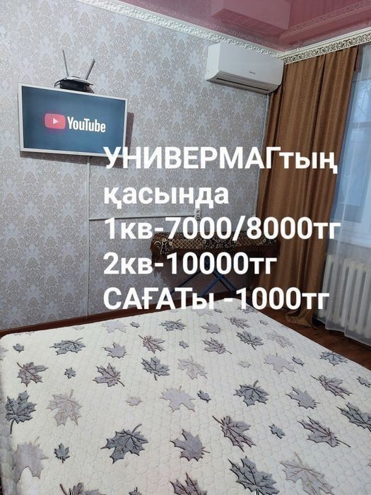 1кв-9000/10000 тг 2кв -1********00тг. САҒАТы-1000тг. УНИВЕРМАГтын қасынан 1 бөлмелі және 2 бөлмелі пәтерді жалға тапсырам. Іші таза, жылы, жайлы және барлық жағдай жасалған. Тұрмыстық техниканын бәрі бар. Интернет, Смарт тв.