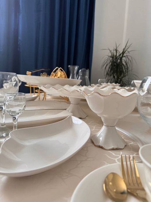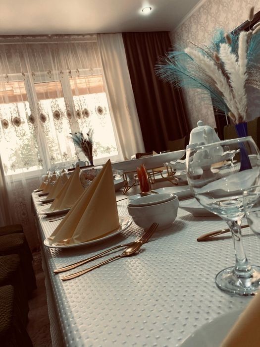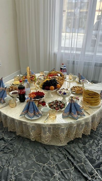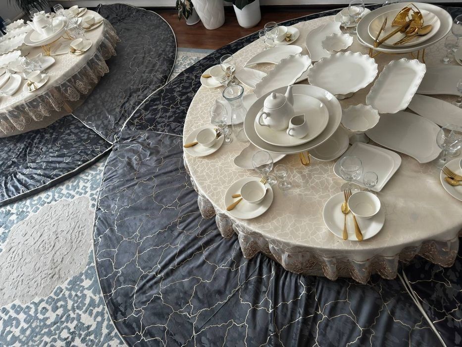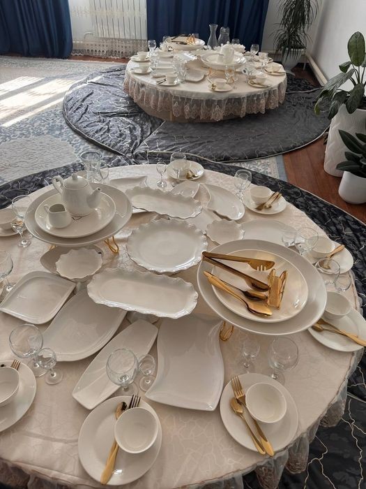 Стол, көрпе, дастархан -1 сут. 6000тг. Ыдыс - аяқ 1 персона 650 тг. ( Осы суммаға фруктовница, конфетница, әр - түрлі тарелкалар салатқа, холодный закускаға арналған тарелкалар, выпечкаға арналған тарелкалар, вилка, қасық, ас табақтар, сорпаға арналған касе, бакал, рюмка, графин, кіреді). Доставка бар 2000тг. Егер 3 столдан жоғары болса тегін жеткізу. Өзіміз апарып- алып кетеміз. (Блогаустроеный үйлерге подъездге диен).