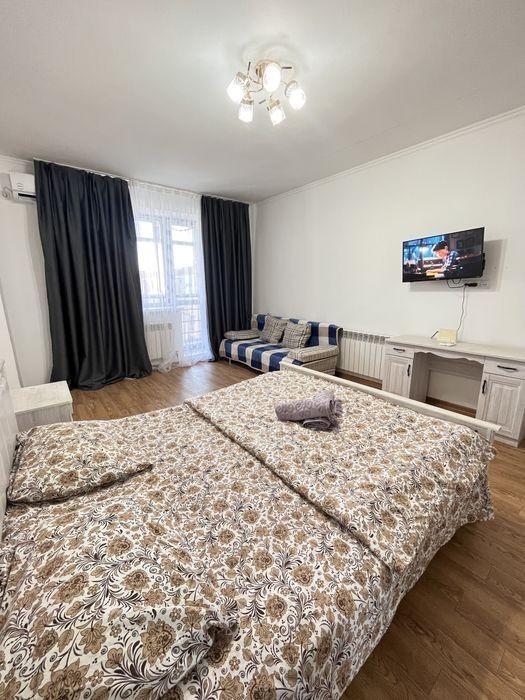 Квартира после евроремонта, мебель и бытовая техника новая. Кровать шириной 2 метра. Чистая и уютная квартира, есть все для длительного проживания. В выходные и будни цены разные.