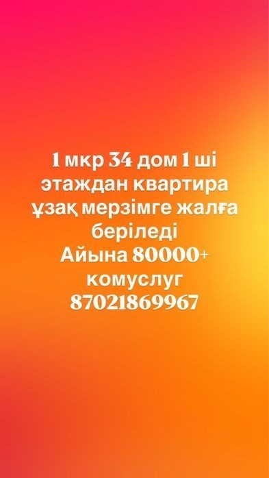 1 мкр 34 домнан 1 ші этаждан 1 бөлмелі пәтер екі бөлме жасалынған, ұзақ мерзімге үй жалданады қасында достық саябағы бар балабақша мектеп поликлиника қасында тиіп тұр центральный отопление жып жылы Стиралка бар ыссы су мұздай су жүріп тұр бағасы 80000 + комуслуг тыныш адамға беремін